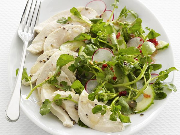 - Toss the cucumber and radishes with the chili sauce, 3/4 teaspoon salt, the remaining 1 tablespoon peanut oil and the remaining 1/4 teaspoon sugar in a large bowl. Add the watercress and toss.